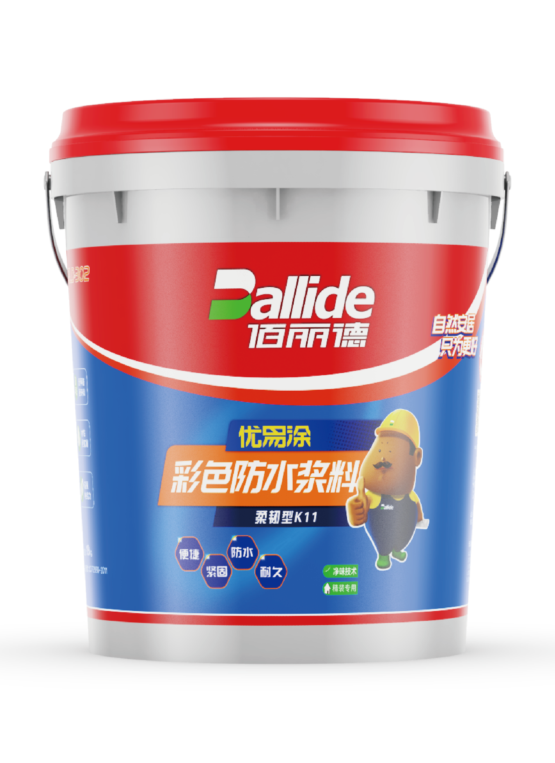 彩色防水漿料(K11柔韌型)是一種雙組分、丙烯酸類高聚物改性的水泥基防水材料,由水泥、級配骨料和精選助劑的粉料及液態(tài)高聚物添加劑等組成。粉料與添加劑混合后,發(fā)生化學反應,形成一層堅韌的彈性防水膜,該膜對混凝土和灰漿有良好的粘附性,能與之形成緊密牢固的永久性結合,阻止了水的滲透。